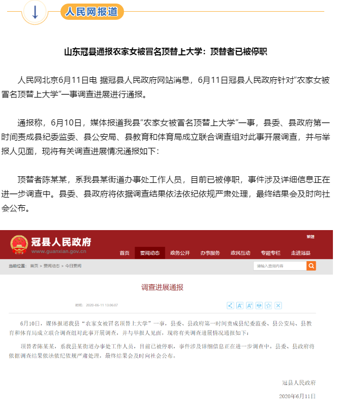 受到舆论关注的“农家女被冒名顶替上大学”一事有了新进展。6月11日,山东冠县通报称县纪委监委、县公安局、县教育和体育局成立联合调查组对此事开展调查,“顶替者陈某某,系我县某街道办事处工作人员,目前已被停职,事件涉及详细信息正在进一步调查中”。此前,山东省教育厅和山东理工大学都表示将全面调查核实,依法依规严肃处理。