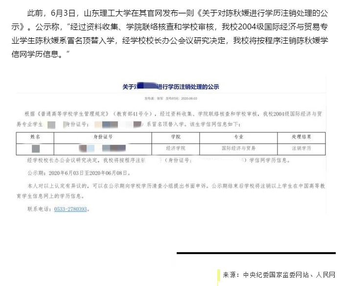 事实上,类似陈秋媛事件涉及高考造假舞弊的情况并非个案,背后往往隐藏着权力滥用甚至腐败问题。无论是修改学籍还是冒名顶替,难度都不小,绝非一两个人所能操作,涉及中学、录取高校、招生部门甚至派出所等多个单位。过往案例说明,这其中,权力运行失序和监督缺席是造假闭环形成的重要原因。有的是相关责任人员不担当不作为,履职不到位,出现造假漏洞,有的是一些学生家长利用关系或金钱开道,“手眼通天”,违规违纪操作。今年5月,艺人仝卓在直播中声称“高考时曾通过一些手段从往届生变为应届生”,就曾引发舆论热议。山西省教育厅等部门正在调查“一些手段”究竟是什么手段、哪些人参与。时间更早一点儿,也有冒名顶替上大学案例曝光。比如,湖南考生罗彩霞被冒名顶替上学背后,就是冒名顶替者的父亲利用“人际关系网”打通了一道道关卡,为自己的女儿提供了顶替的“绿色通道”。又比如,河南“王娜娜被冒名顶替上大学”事件处理结果中,也有当地高中教务处、县高招办、派出所以及高校招生就业处工作人员多人牵涉其中,最终13名责任人被处理,3人被移交司法机关。