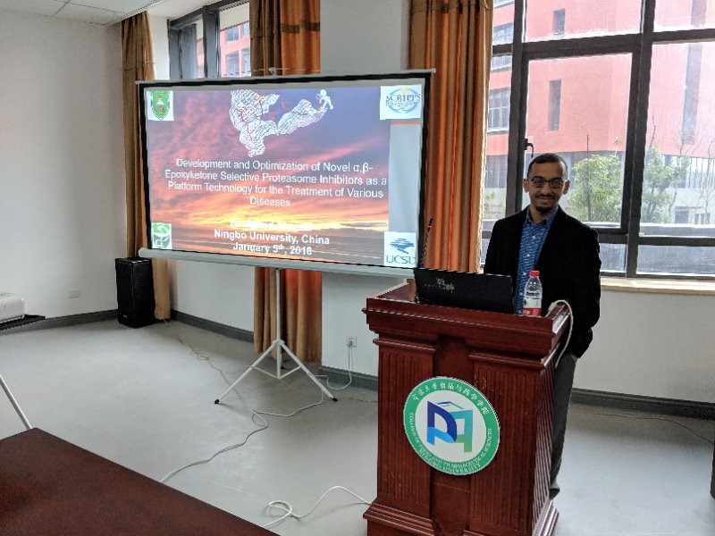 Jehad Almariti教授介绍了近几年来自己从事药物化学领域研究的一些最新进展。通过计算机辅助的药物设计手段和化学全合成方法制备得到一系列蛋白酶体抑制剂卡霉素(Carmaphycin)类似物。经全面的结构优化,成功解决了Carmaphycin的细胞毒性大的问题,最终获得了高抗疟活性的先导化合物。此科研成果已发表在药物化学顶级期刊Journal of Medicinal Chemistry上。