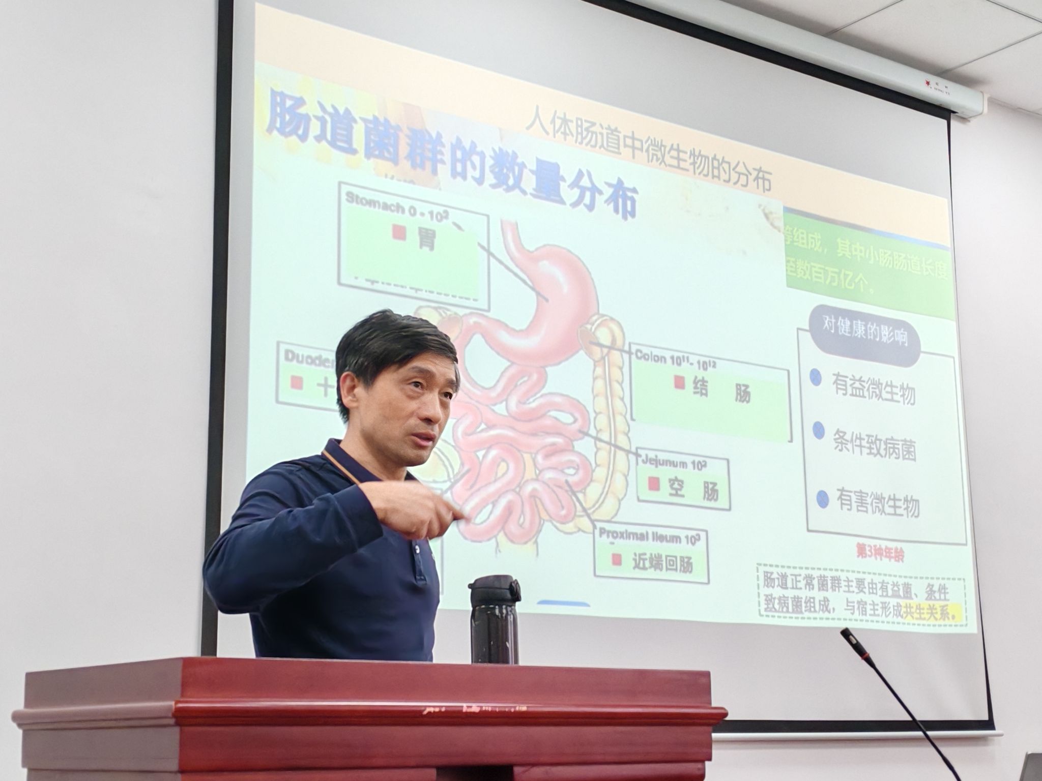 吴教授以其一贯的严谨治学态度和深厚的科研积累,为与会者呈现了一场既富含知识深度又兼具趣味性的学术盛宴。他首先探讨了肠道健康与精神健康之间错综复杂而又至关重要的联系,深入浅出地剖析了肠道菌群如何对精神健康产生深远影响,揭示了肠道作为人体“第二大脑”的神奇奥秘。通过详实的科学证据和生动的案例,他着重强调了肠道与大脑双向互动的奇妙机制,这一机制在调节人类情绪、认知等精神层面发挥着至关重要的作用。