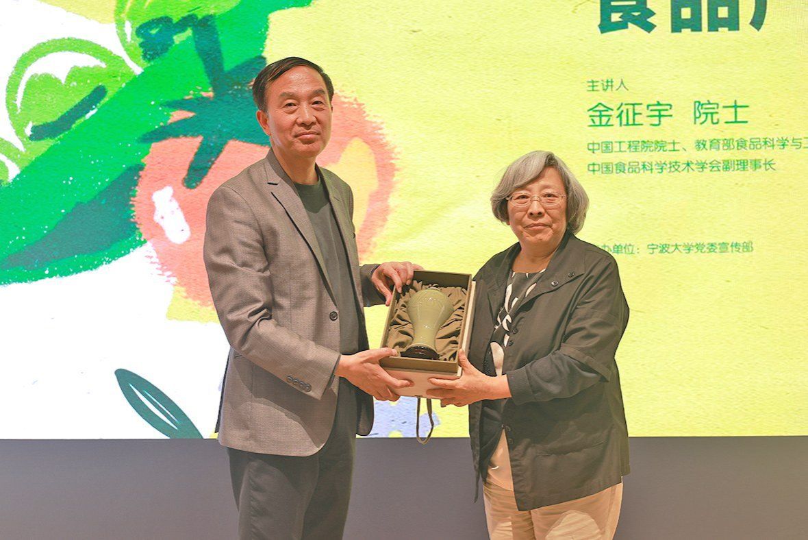 向金征宇院士赠送了象征宁波文化底蕴的“古越青瓷”纪念品,寓意此次讲座如同古越青瓷一般,字字温润,意蕴深远,值得永远珍藏!