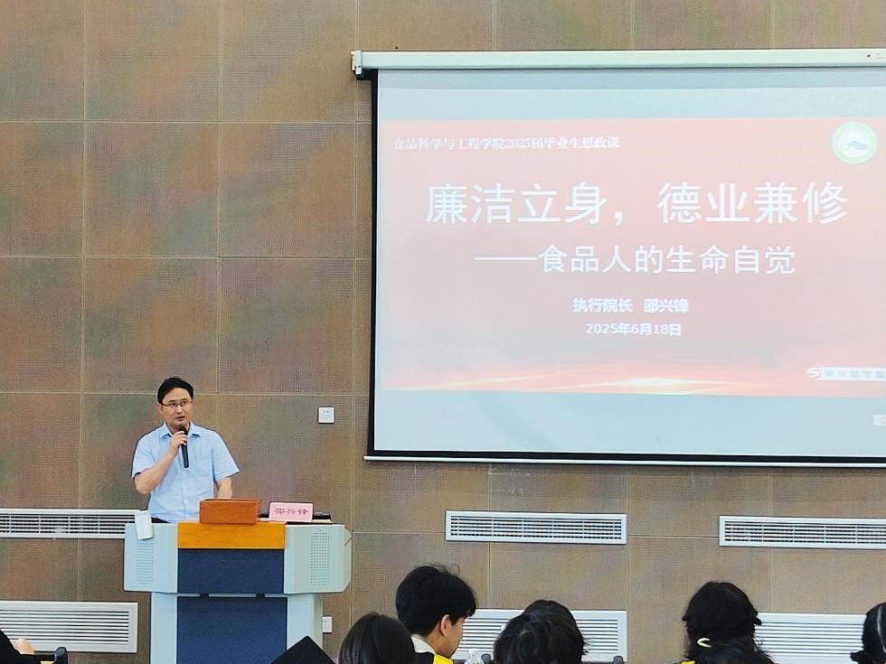 在国际楼3楼阶梯教室开展“大学最后一堂思政课”。执行院长邵兴锋以“廉洁立身,德业兼修——食品人的生命自觉”为主题授课,围绕“做人、做事、做学问”三个维度,为2025届全体毕业生上了一堂兼具专业深度与廉洁警示的“毕业必修课”。香港六合彩开奖网