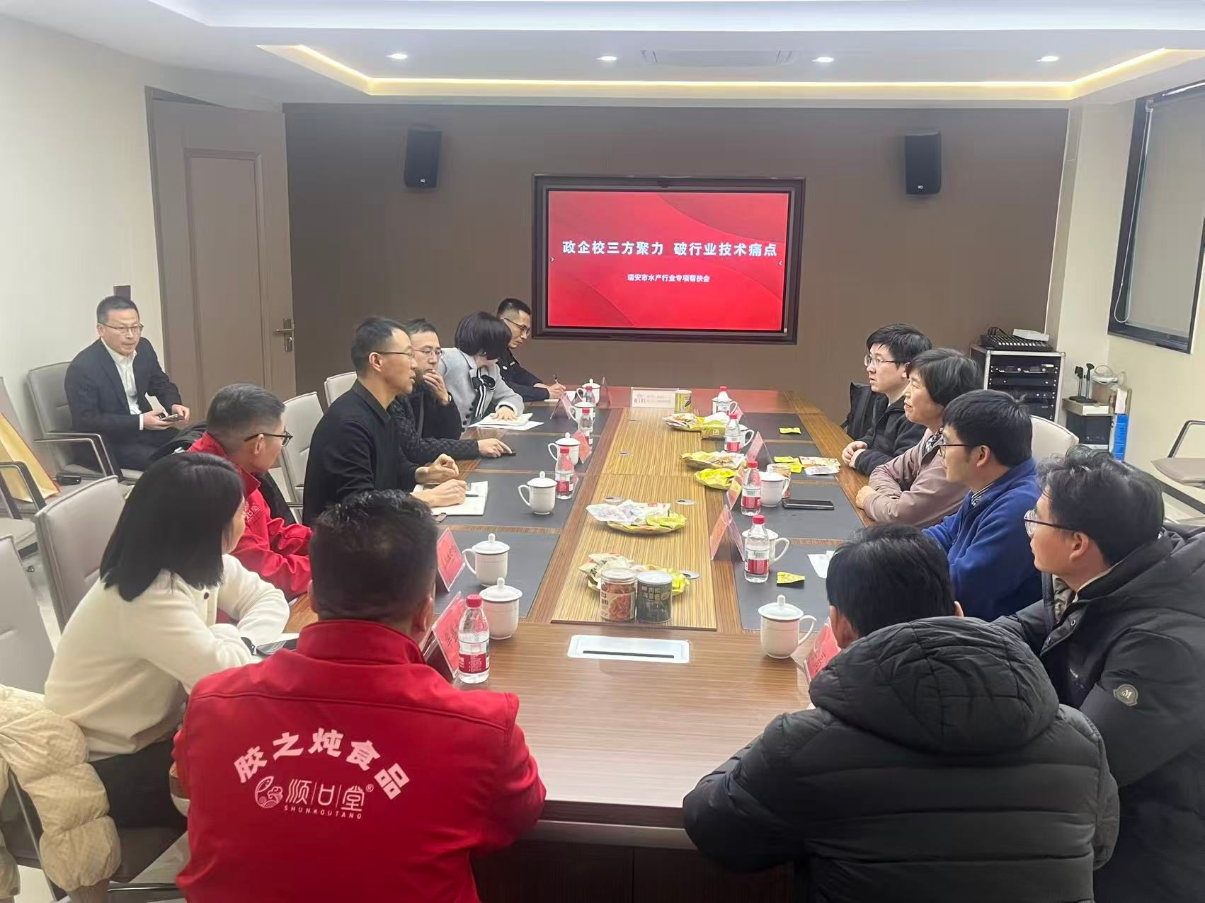 杨文鸽教授团队一行5人于12月12日赴浙江瑞安市参与由瑞安市市场监督管理局牵头、联合瑞安市食品行业协会共同举办的水产行业专项帮扶会。浙江香海食品股份有限公司、瑞安市华忠水产食品有限公司、瑞安市华盛水产有限公司、温州丰和海洋开发有限公司、温州胶之炖食品有限公司和瑞安市小蟹总食品有限公司6家企业参加了此次活动。