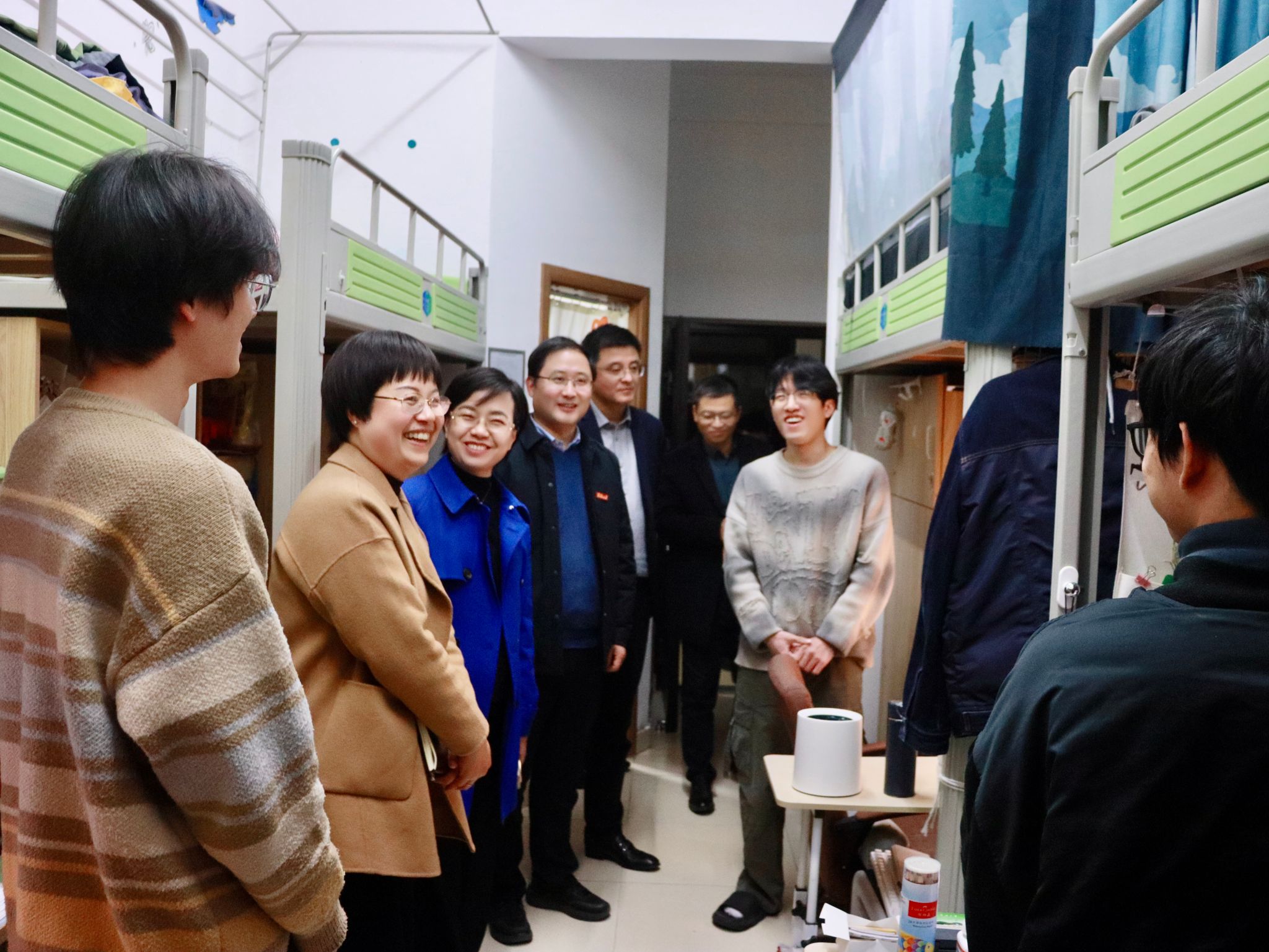 在学生宿舍,校领导与同学们亲切交谈,细致询问学习生活安排和假期计划,嘱咐同学们合理安排假期,注意安全、充实自我。