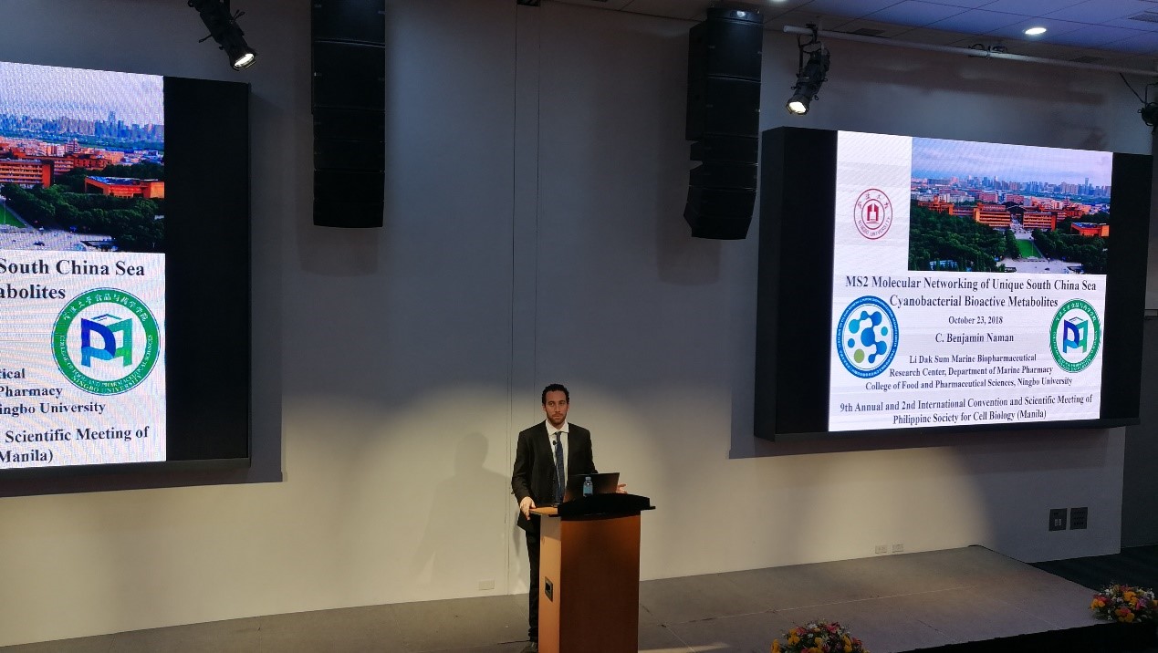 近年在国家111引智基地和李达三叶耀珍伉俪李本俊海洋生物医药发展基金的支持下,通过外专引智与国际合作,在海洋药物研发、科学潜水与海洋生物资源挖掘、海洋健康产品开发方面的研究进展。Ben的报告《MS2 Molecular Networking of Unique South China Sea Cyanobacterial Bioactive Metabolites》介绍了基于分子网络技术从中国南海蓝藻中发现新天然产物及其药用活性的工作进展。PSCB学会主席Mary Beth B. Maningas教授为何山和Ben颁发了大会报告专家荣誉证书。他们的研究工作得到了国家重点研发计划项目(2018YFC0310901)、国家自然学基金面上项目(41776168)和外国青年学者国际合作项目(81850410553)的支持。
