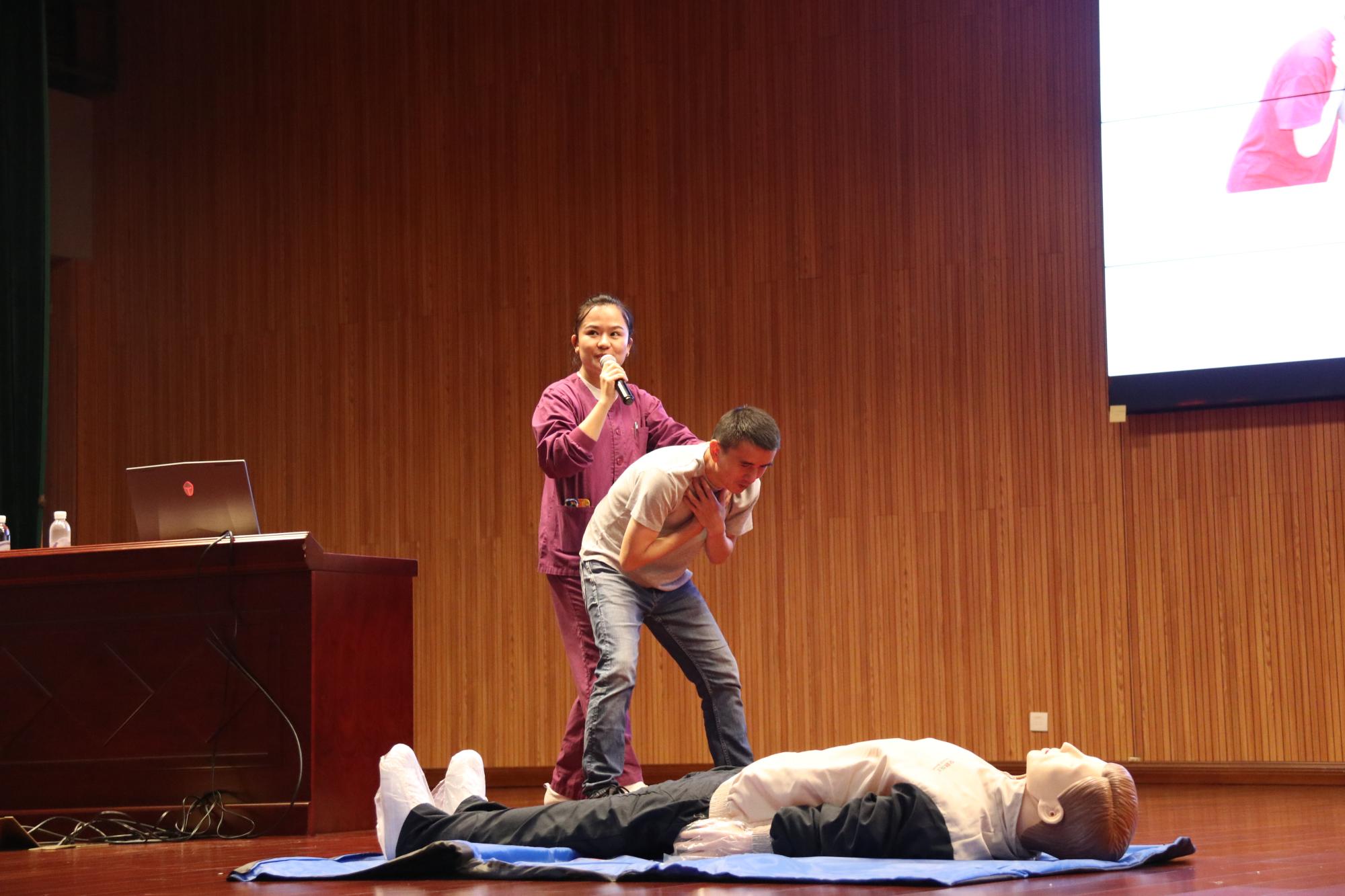 附属医院急诊外科主管护师韩涵楠进行现场急救技能指导。