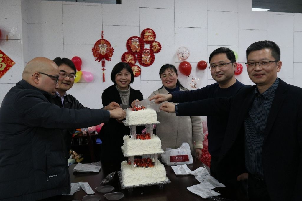 事业蒸蒸日上的蛋糕。现场气氛热烈,掌声、喝彩声此起彼伏。