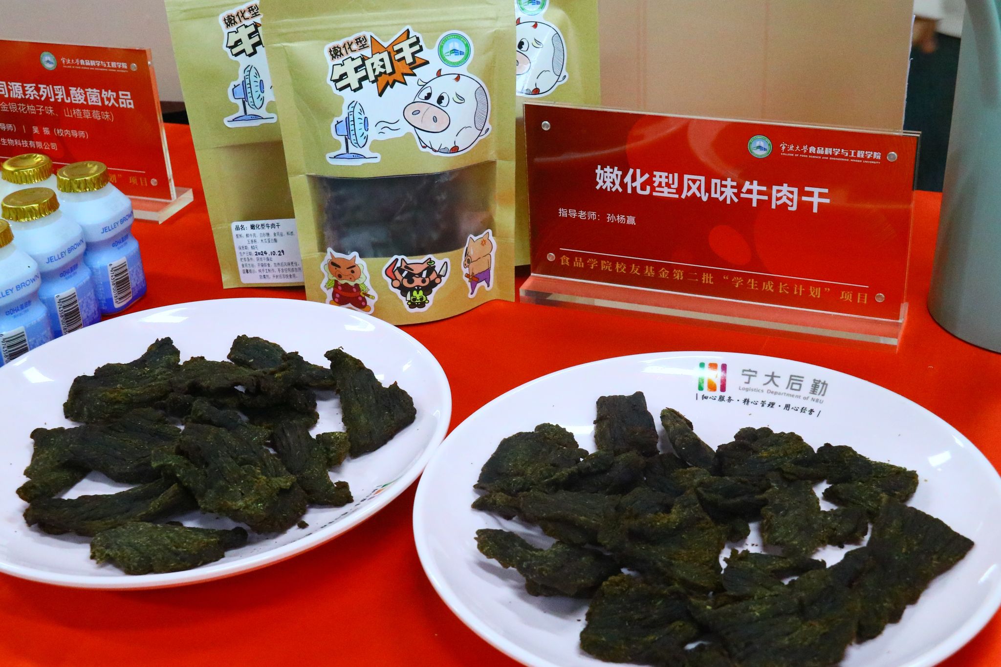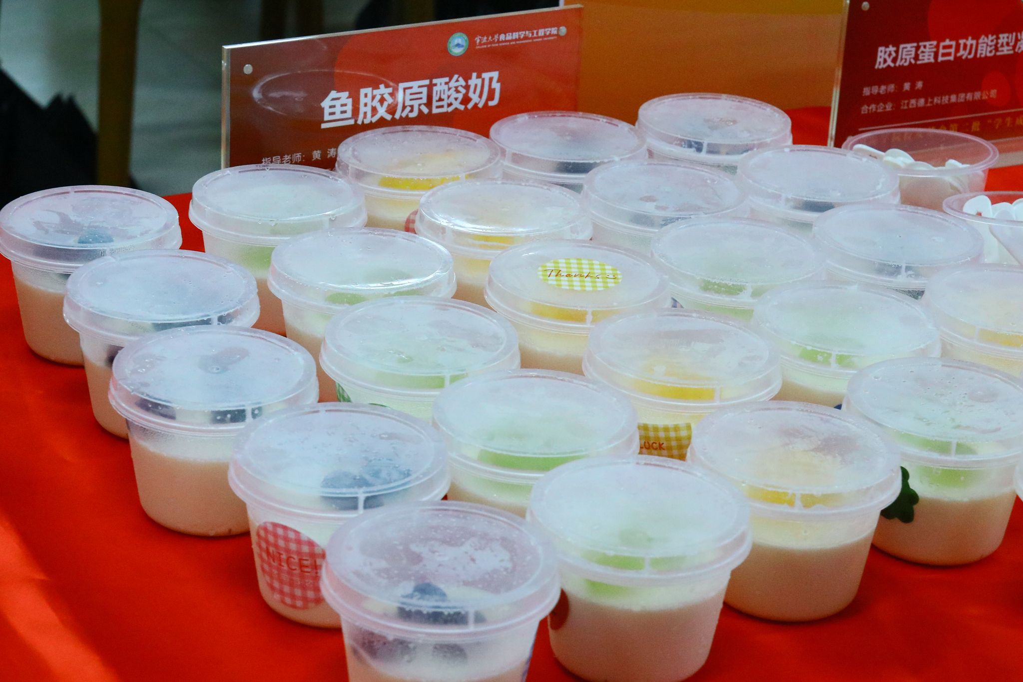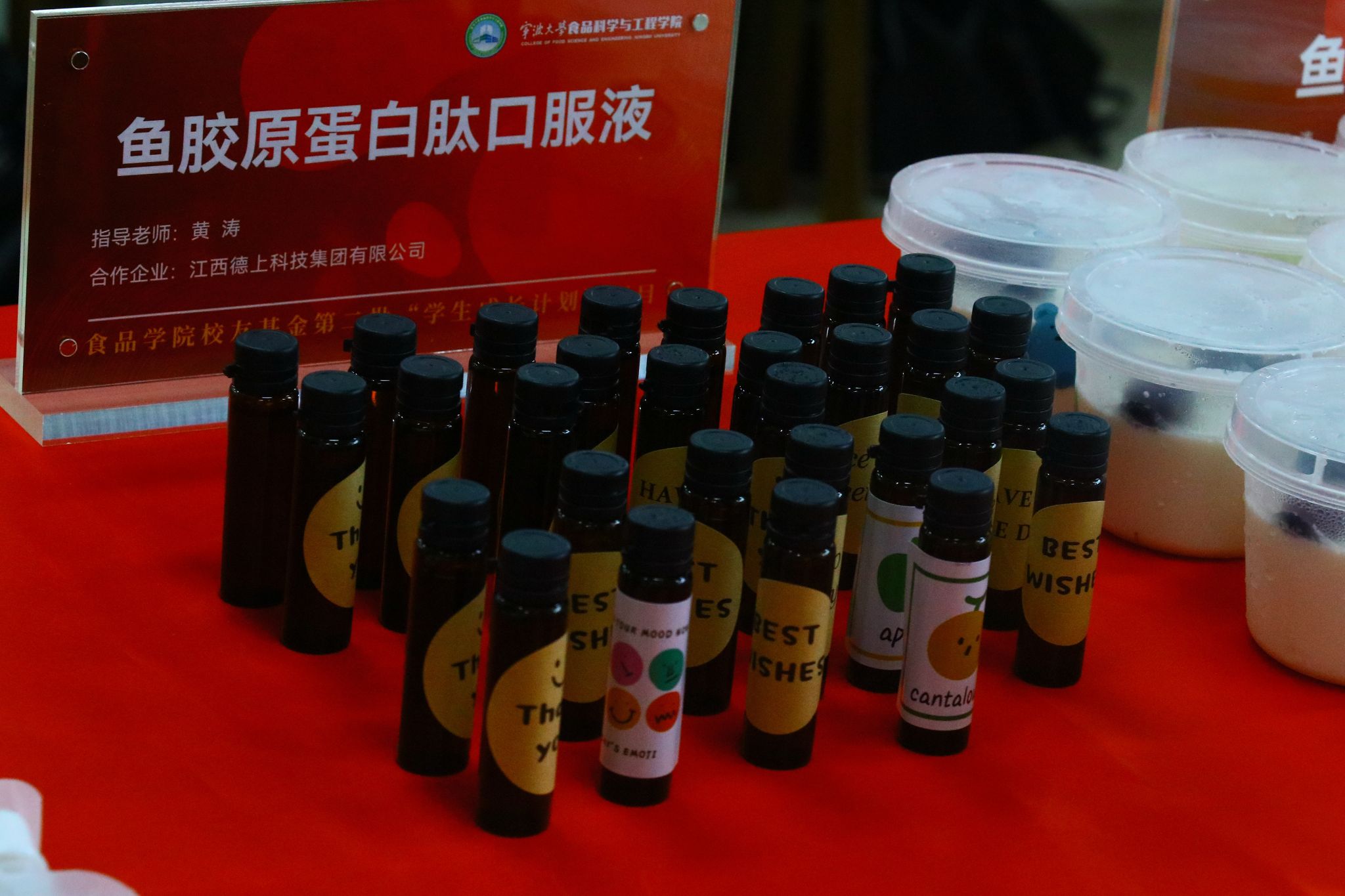 值得一提的是,此次品鉴会所展示的产品均来自第二批“学生成长计划”项目,并与部分企业开展了合作。学生们在专业老师的悉心指导下,重点聚焦于产品开发与制作,经过反复试验与优化,最终成功研发出了一系列兼具创新性、市场性和社会性的美食与文化产品。如与江西德上科技集团有限公司合作研制的鱼胶原蛋白肽口服液、鱼胶原酸奶、鱼明胶咖啡等系列高胶原蛋白食品,将胶原蛋白与饮品结合,提升饮品的顺滑感与营养价值,满足都市群对健康与便利的需求。与宁波益富乐生物科技有限公司合作研发的药食同源系列乳酸菌饮品,提高了传统乳酸菌饮品的保健功效。