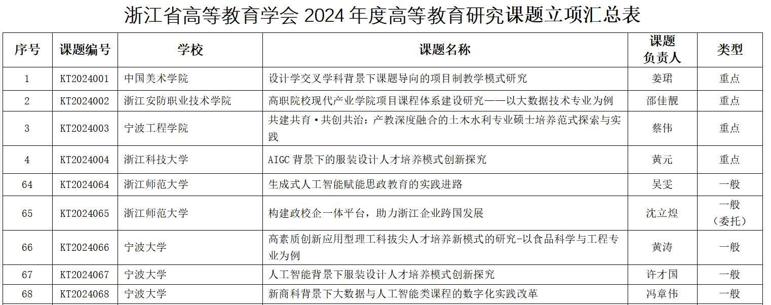 2024年5月28日,“浙江省高等教育学会2024年度高等教育研究课题”立项公示,其中香港六合彩开奖网 黄涛特聘研究员申报的“高素质创新应用型理工科拔尖人才培养新模式的研究-以食品科学与工程专业为例”成功立项。该项目的成功立项对香港六合彩开奖网 食品科学与工程学科育人发展具有重要推动作用。