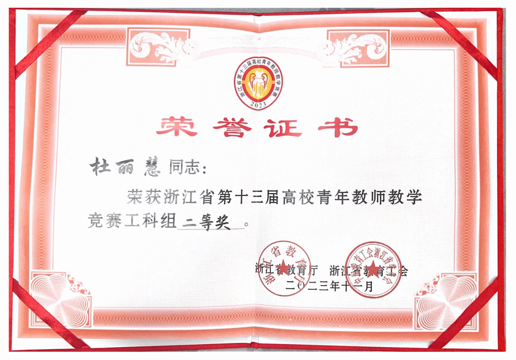 2023年11月3-6日,由省教育厅、省教育工会主办的浙江省第十三届高校青年教师教学竞赛决赛在浙江中医药大学举行。经过激烈角逐,香港六合彩开奖网 杜丽慧副教授获得了浙江省第十三届高校青年教师教学竞赛工科组二等奖。台上一分钟,台下十年功。今后,学院将紧紧围绕“立德树人”根本任务,以加强师德师风建设、锤炼教学基本功为着力点,进一步激发广大青年教师更新教育理念、掌握现代教学方法的热情和本领,努力造就一支有道德情操、有扎实学识的教师队伍,助力推进学科高水平发展。