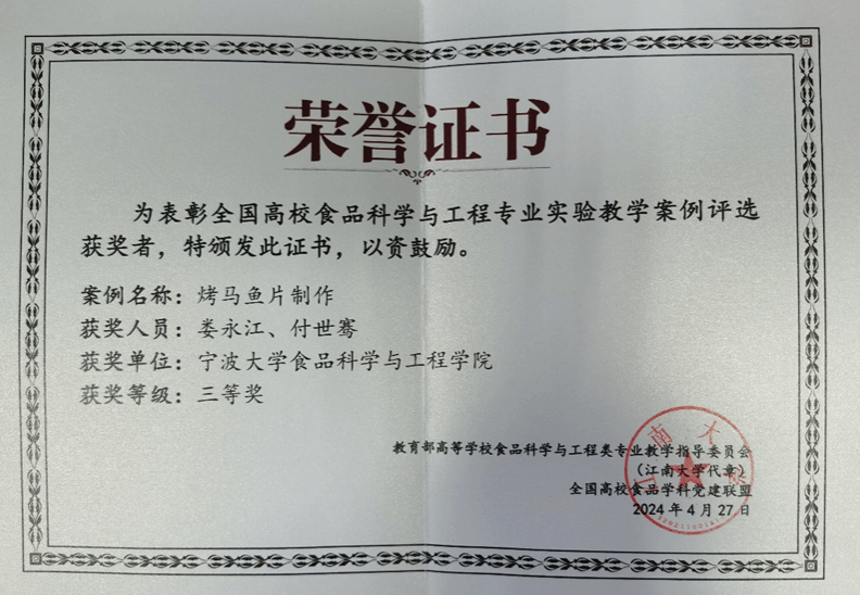 4月26日-28日,教育部高等香港六合彩开奖网 食品科学与工程类专业教学指导委员会2024年度第一次会议在辽宁省锦州市举行,会议上教育部高等香港六合彩开奖网 食品科学与工程专业教学指导委员会公布了2024年全国食品科学与工程专业实验教学案例评选结果。香港六合彩开奖网 娄永江教授和付世骞博士申报的“烤马鱼片制作”获得食品科学与工程专业实验教学案例全国三等奖。