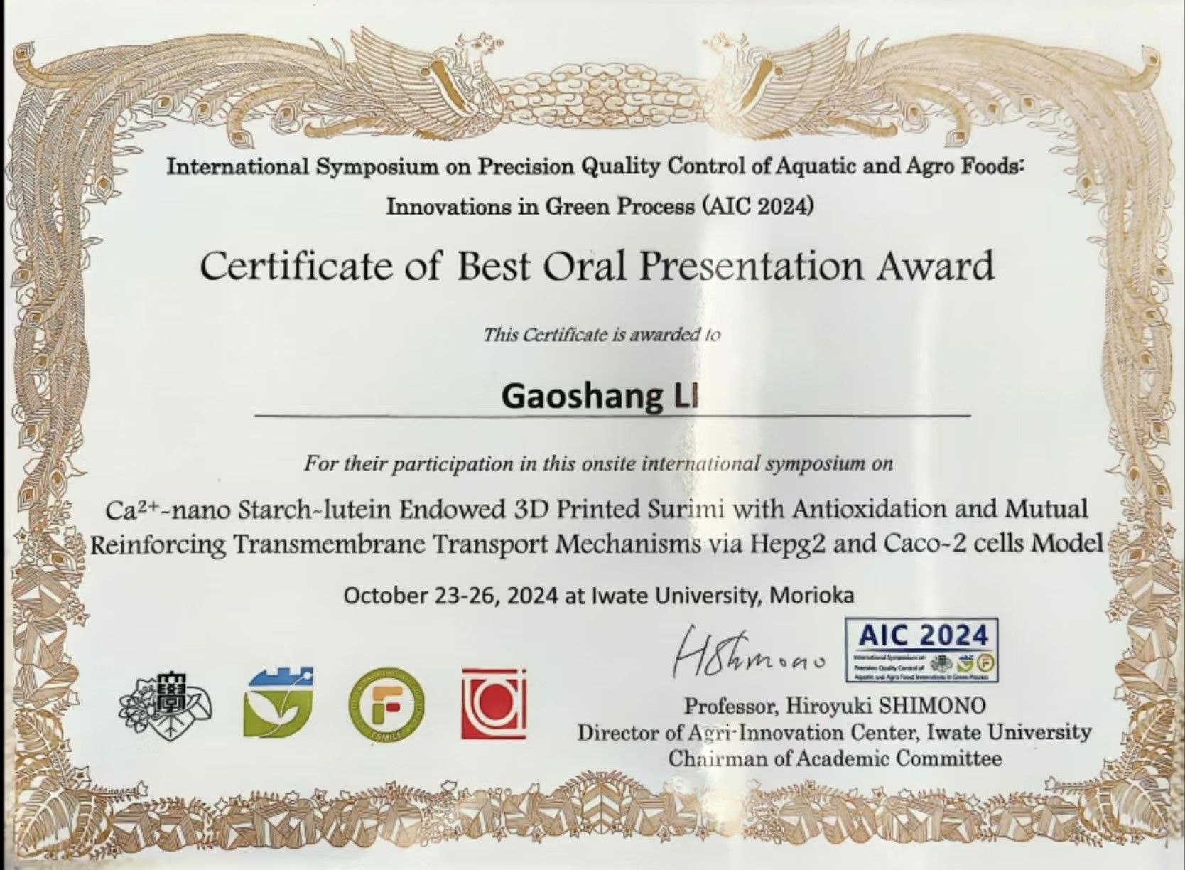 在会议上,魏华茂副研究员作为本次会议的特邀嘉宾,发表了关于虾及虾干制品嫩化技术的主题报告,并深入剖析了老年食品中虾制品开发的最新成果与广泛应用前景。贾茹副教授与李高尚博士也分别带来了关于Pickering在鱼糜制品中的创新应用,以及3D打印钙离子-纳米淀粉-叶黄素-鱼糜的消化特性、抗氧化性、跨膜吸收转运特性的变化及其机制探究。经大会评审,贾茹副教授与李高尚博士双双荣获“Best Oral Presentation Award”。