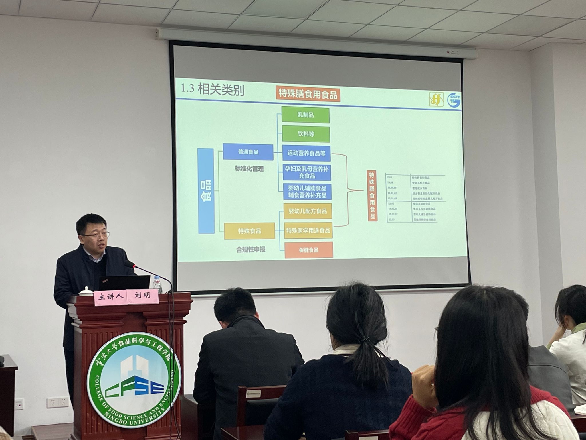 讲座中,刘明老师分别从功能性性食品的类别、合规性管理法规、特殊食品标准化、功能性原料标准四个方面出发,对功能性食品做出了全面的介绍。刘老师还举例了营养强化食品、特殊膳食用食品、保健食品的定义分类,并对食品法规、国家标准进行解读。讲座结束后,刘老师与师生们进行了交流和讨论。