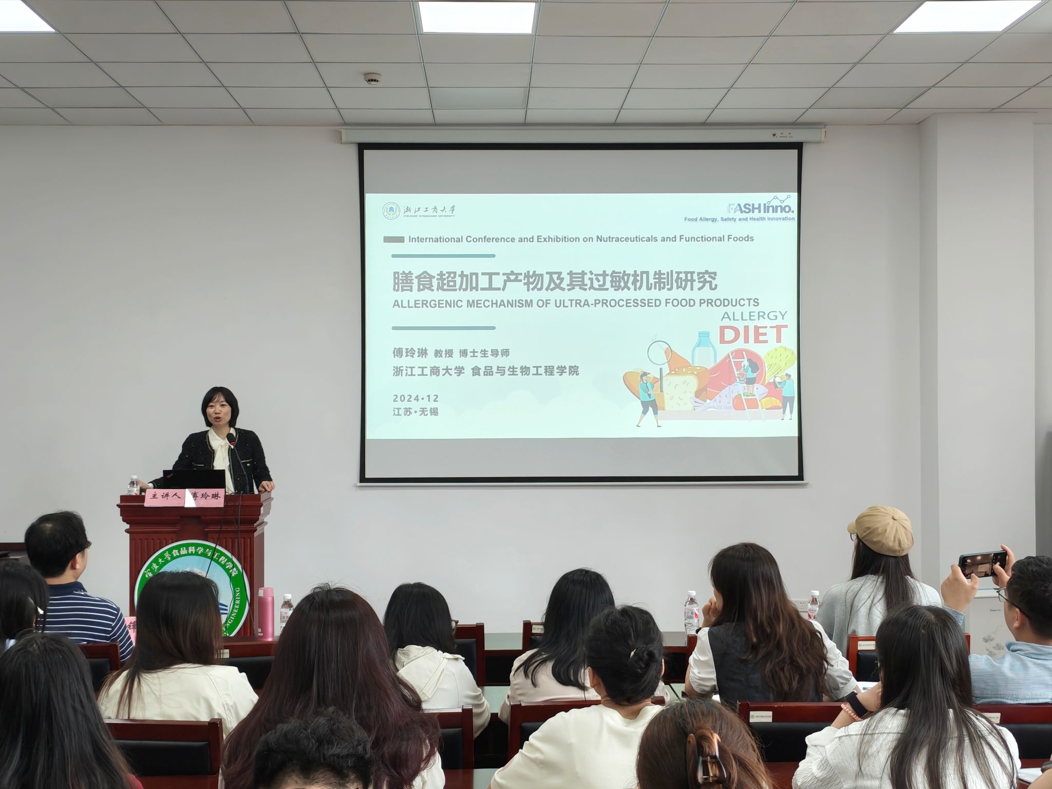 首先,傅玲琳教授从食品过敏免疫学机制、食品致敏原筛选及鉴定、食品致敏风险识别与控制三个方面介绍了食品致敏与安全与健康领域的研究。傅教授指出,近30年过敏性疾病增长了3倍,已成为全球第6大慢性病。其中,摄入含晚期糖基化终末产物(AGEs)的超加工食品与过敏性疾病显著相关,长期高AGEs膳食会诱发并加重食物过敏症状。此外,傅教授还讲解了长期摄入膳食AGEs对肠道菌群的影响以及RAGE/TLR4通路在促过敏进程中的作用,提出未来研究方向将主要集中在不同类型AGEs的作用分析、肠道菌群的影响作用研究和固有免疫通路的机制挖掘等方面。