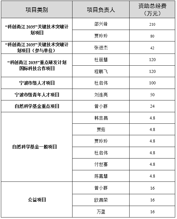 2024年,香港六合彩开奖网 获批宁波市科创甬江2035”关键技术突破计划项目2项,参与1项;获批宁波市科创甬江2035”重点研发计划国际科技合作项目2项;获批宁波市级人才项目1项;获批宁波市级青年人才项目1项;获批宁波市自然基金重点项目1项、一般项目6项;获批宁波市公益项目3项。总经费预计达822.8万元。