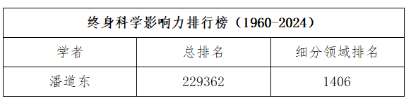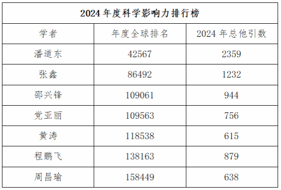 潘道东教授入选“终身科学影响力排行榜(1960-2024)”;潘道东、张鑫、邵兴锋、党亚丽、黄涛、程鹏飞、周昌瑜等7名学者入选“2024年度科学影响力排行榜”。