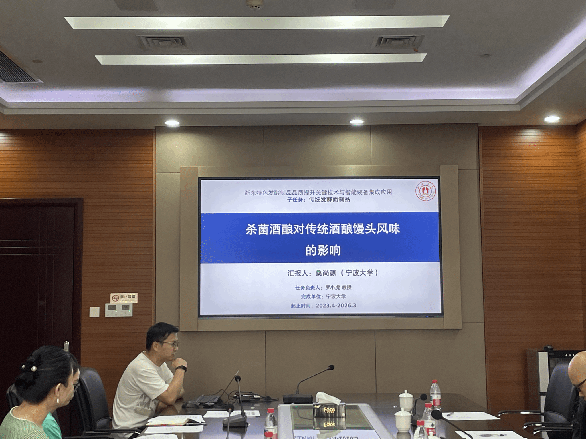 会上,项目组成员依次总结了目前研究成果。在汇报环节中,吴振首先介绍了定向筛选关键发酵菌株的研究进展,重点展示了健康功能标签注释及乳酸菌基因组测序成果,并结合优势菌株特性,对关键发酵微生物的共酵机制和风味形成规律进行了初步探索。随后,欧昌荣围绕乳酸菌在海产品发酵中的应用进行了汇报,强调了乳酸菌互作以及单一磁场作用对海产品风味提升的影响。桑尚源则分享了杀菌酒酿在传统酒酿馒头加工中的应用效果,指出其对产品风味具有显著影响。沈存宽的汇报聚焦于米馒头的发酵工艺优化与营养强化,他提出在乳酸菌测序过程中发现存在抗生素抗性基因,需进一步分析原因,并加强菌株标注及协同机制研究。邢家溧汇报了标准检测与验证工作的进展。最后,宁波老底子公司负责人冀军武介绍了公司近期推出的切三味鸡、糟鸡爪、糟带鱼、免切咸草鸡新产品,并就工厂自动化生产线一体化建设中存在的问题与改进方向进行了交流。