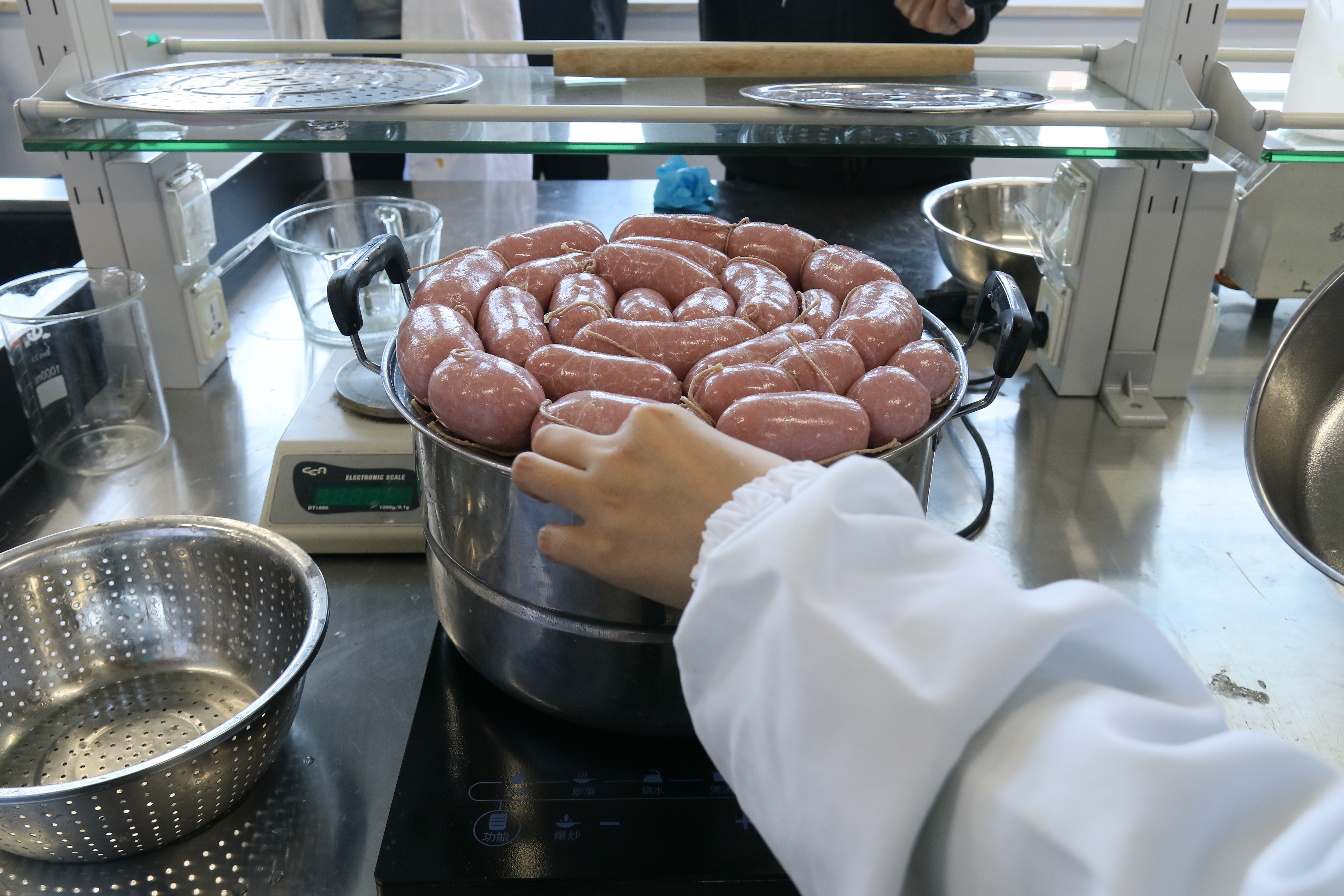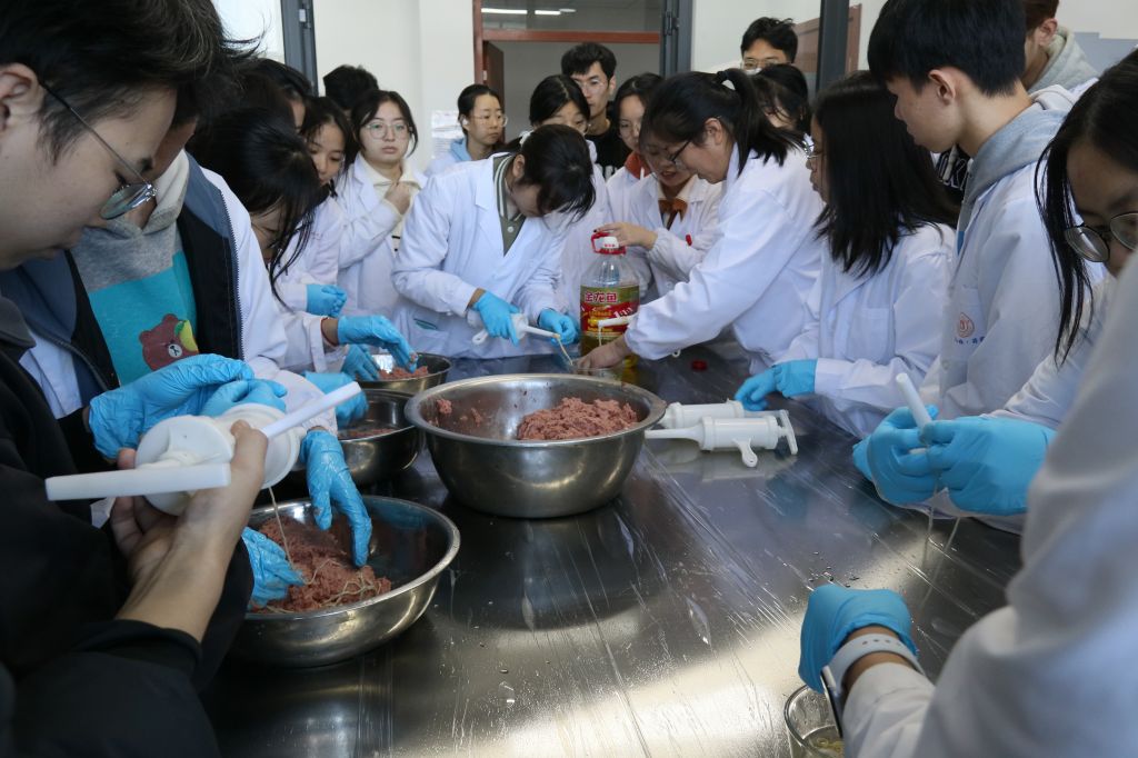 第一课堂上专业老师孙杨为学生们详细介绍了肉肠制作的具体过程,深入解释了其中涉及到的实验原理。这一过程使学生们亲身感受到食品制作工艺的原理,打开了一扇通向专业知识深度理解的新大门,使他们更加深刻地理解与掌握专业知识。