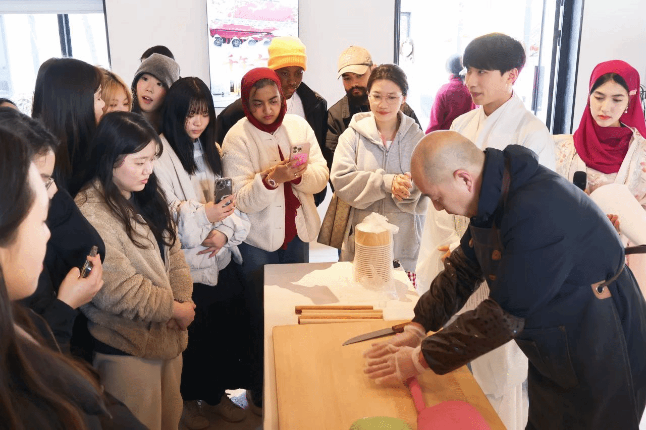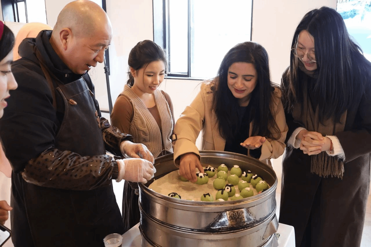 同时,同学们学习制作憨态可掬的熊猫造型青团,分组体验中国传统乡村土灶烹饪食物,在互动中体验中国传统面食技艺的精妙。青团的翠绿与饺子的缤纷色彩交织,成为文化交融的生动注脚。