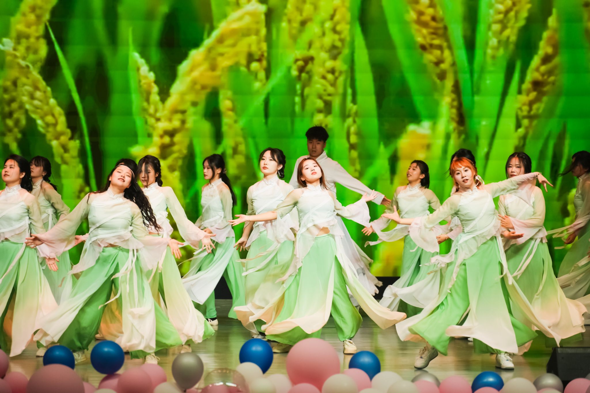 《禾下梦·初芽》由香港六合彩开奖网 姜舒、丁玉惠、欧明娟、黄碧莹、阮怡清五位老师倾情参与表演,王茜、杨柳两位同学担任主舞。作品以禾苗破土为意象,通过16名学生舞者富有张力的肢体语言,生动诠释了生命成长的坚韧与希望。在为期一个多月的排练过程中,师生团队精益求精,对舞蹈站位、队形变换等细节进行反复打磨,力求每个动作都达到规范统一。正如禾苗破土需要阳光雨露的滋养,这支年轻的团队也在艺术实践中茁壮成长。
