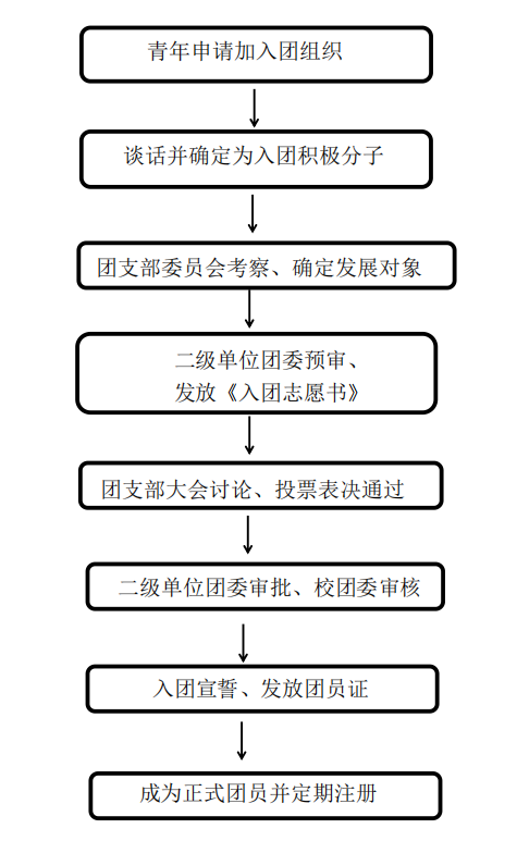 注意事项:符合条件的青年提出入团申请,团组织安排谈话并确定入团积极分子。团组织指定两名团员作为申请人的介绍人,介绍人应负责地向申请人说明团章等团内信息,向团的组织说明申请人的思想、表现和经历。经团支部委员会资格审查和二级单位团委预审,确定发展对象,《入团志愿书》开学返校后由团支部委员会指导发展对象填写。经团支部大会讨论(支部半数以上有表决权的团员出席)、无记名投票、表决通过(表决赞成票超过到会有表决权团员二分之一数即为通过),结果报送二级单位团委审批。入团时间按照团支部大会召开通过时间为准。