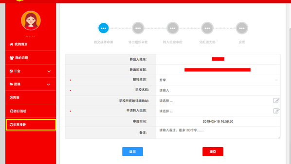 团员申请详细操作流程:团员登录系统进入个人中心,点击左侧“关系转接”菜单。